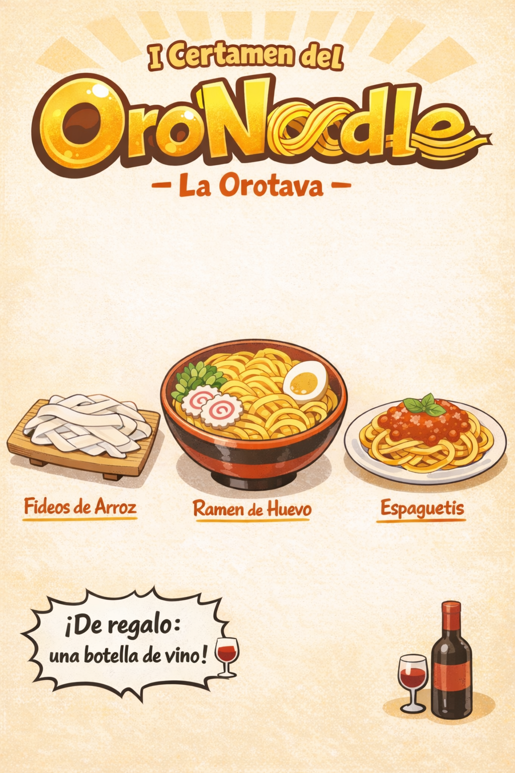 Esto no es “un evento más”. Es el primer certamen de OroNoodle en La Orotava: 3 tipos de noodles, pasta fresca para probar, y encima te puedes llevar la experiencia a casa.